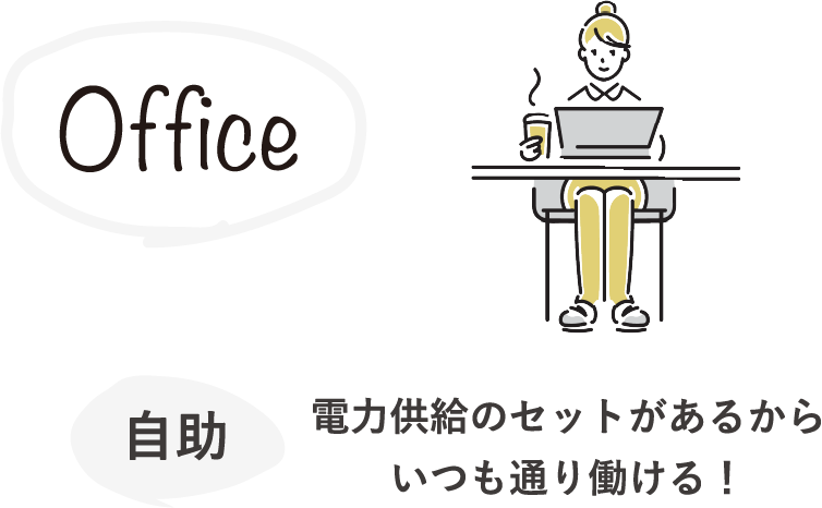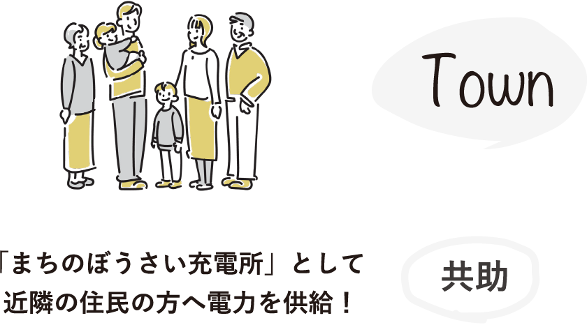 災害時に大切なのは、まずは自分を守る「自助」そして、地域や身近にいる人同士が助け合う「共助」といわれています。災害時には、情報の取得や家族の安否確認に欠かせない携帯電話やスマホの充電の場、「共助」の思いで助け合う電力供給の場としての機能も果たすことができます。