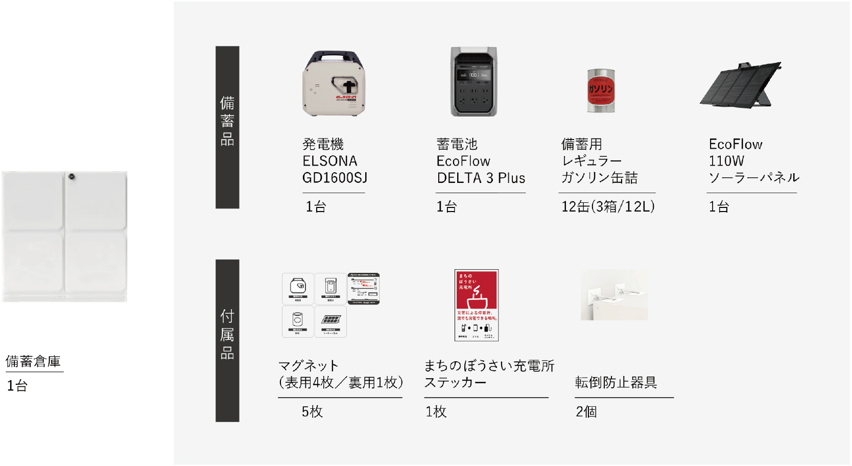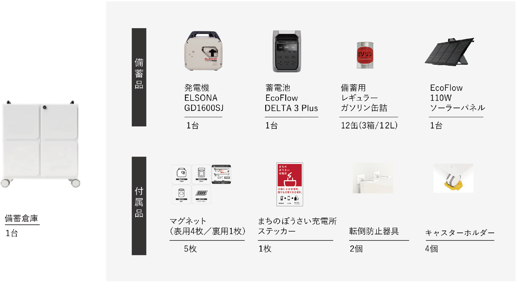 | 備蓄品 | 【発電機】 ELSONA GD1600SJ 1台 【蓄電池】 EcoFlow DELTA 3 Plus 1台 【ソーラーパネル】 EcoFlow 110W ソーラーパネル 1台 【燃料】レギュラーガソリン缶詰(1缶1L入り) 12 缶(12L) |