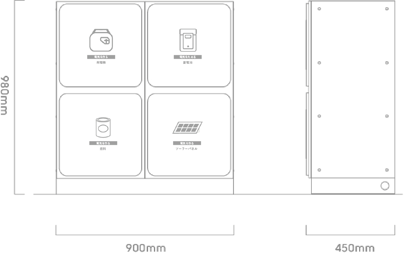 | 備蓄庫 | A: キャスターつき サイズW900 x D450 x H1050 mm B : 据置型 サイズ W900 x D450 x H980 mm |