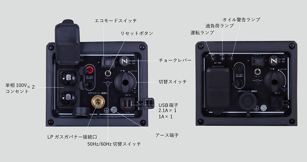 | 定格出力(kVA) | LPガス 1.53 / ガソリン 1.7 |