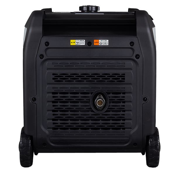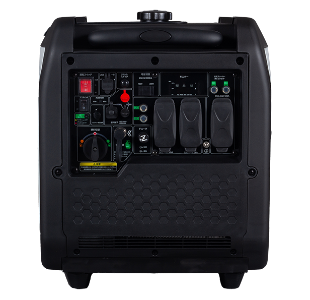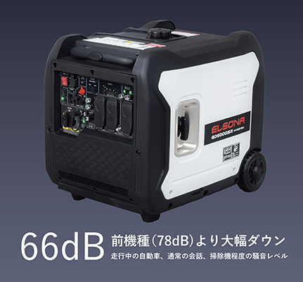 インバーター制御により高質な正弦波形を出力。動作音も66dBと電車の車内や掃除機ぐらいと静音です。また、エコスイッチをONにすれば負荷に応じてエンジン回転数を自動調整し、低燃費運転を実現します。