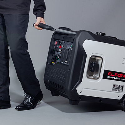 ハンドルがのばせて、軽量でコンパクトな発電機だからキャリーケースのように持ち運べて移動もスムーズ。災害時、発電機を持ち運ぶ際も手間取りません。