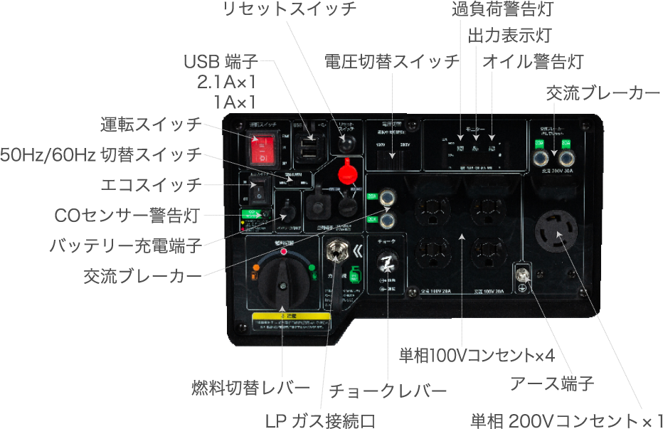 | 定格出力(kVA) | LPガス 4.5 / ガソリン 5.0 |